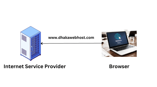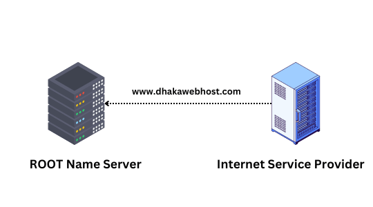 যখন দেখলো ব্রাউজার www.dhakawebhost.com নামটাকে চিনছে না তখন ব্রাউজার এই ডোমেইনটা Resolver Server বা আমরা সাধারণত একে বলি ISP (Internet Service Provider) নামে আরেকটা সার্ভারে অনুরোধ পাঠাবে । এই ISP হল আপনার ব্যবহৃত ইন্টারনেট প্রোভাইডার । এখানে আপনি গ্রামীণফোনের ইন্টারনেট ব্যবহার করছেন । তো এই লেখায় ISP হল গ্রামীণফোন । ব্রাউজার ISP কে বলবে, “ভাই আমি www.dhakawebhost.com এর আইপি জানি না, আপনি আমাকে আইপি জানতে সহায়তা করুন ।” তখন ISP তার ক্যাশ মেমরি চেক করবে । সেখানে যদি ডোমেইনটির তথ্য থেকে থাকে তবে সে দিয়ে দিবে । ধরলাম, ISP তে সে ডোমেইনের কোন তথ্য নেই । তখন, ISP আবার ROOT SERVER নামের আরেকটি সার্ভারকে অনুরুধ করবে ।
